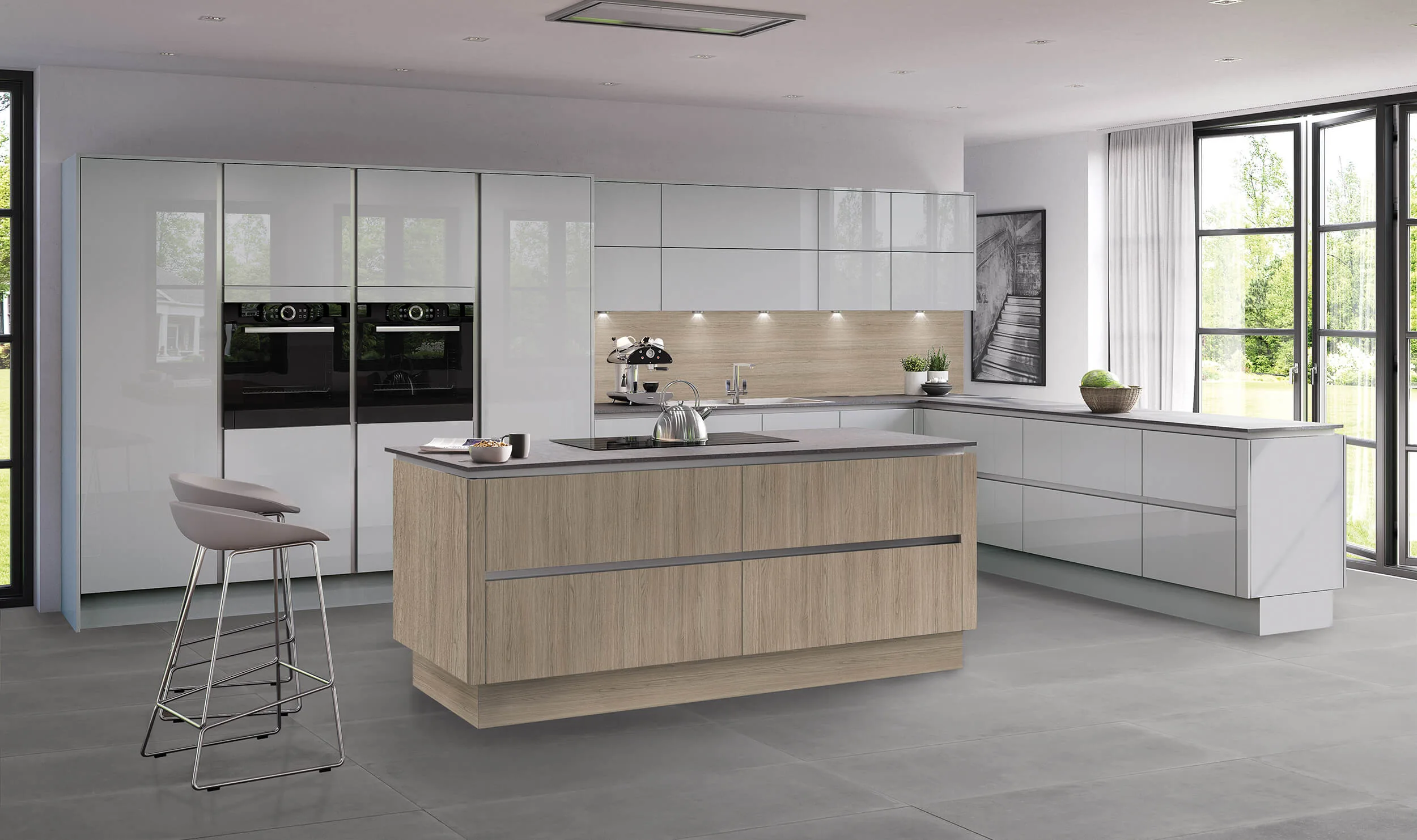 Gloss white German kitchen with contrasting wood cabinets