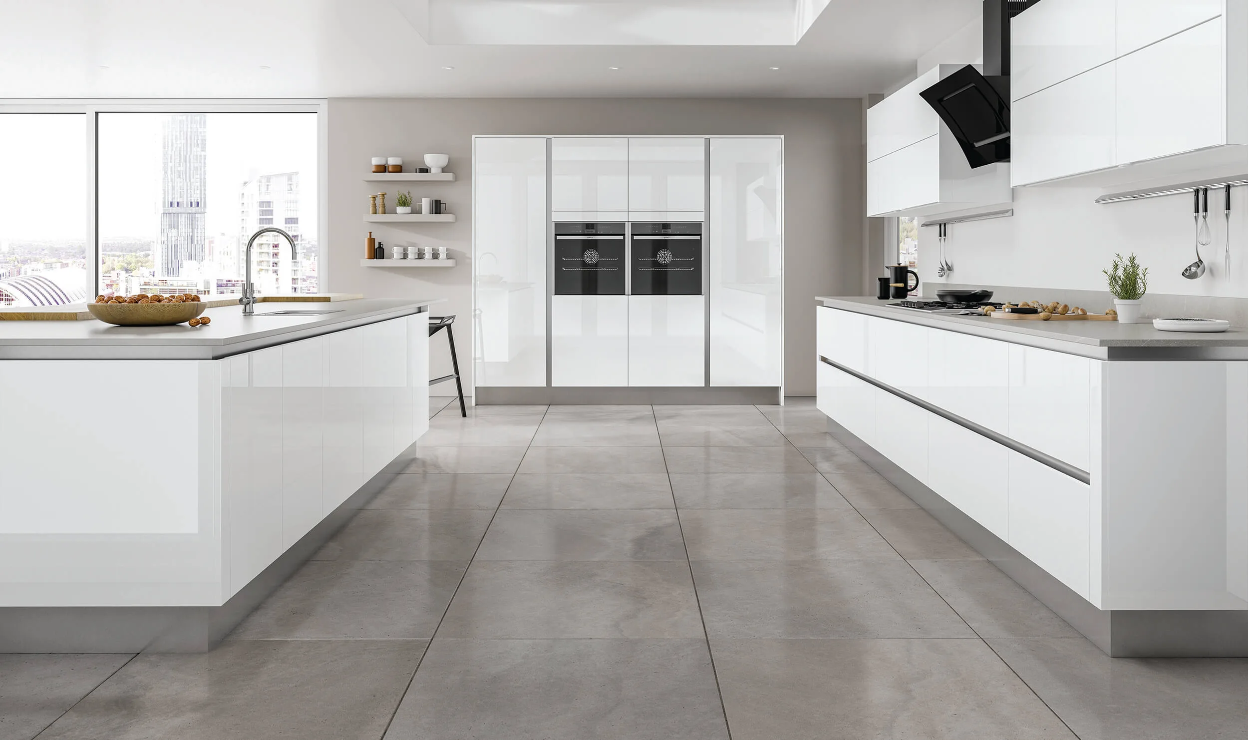 Gloss white German kitchen with grey countertops