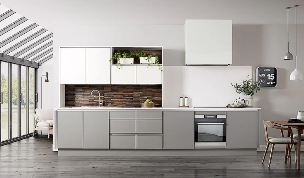 Grey and white minimalist handleless kitchen with white countertops and gloss cupboards