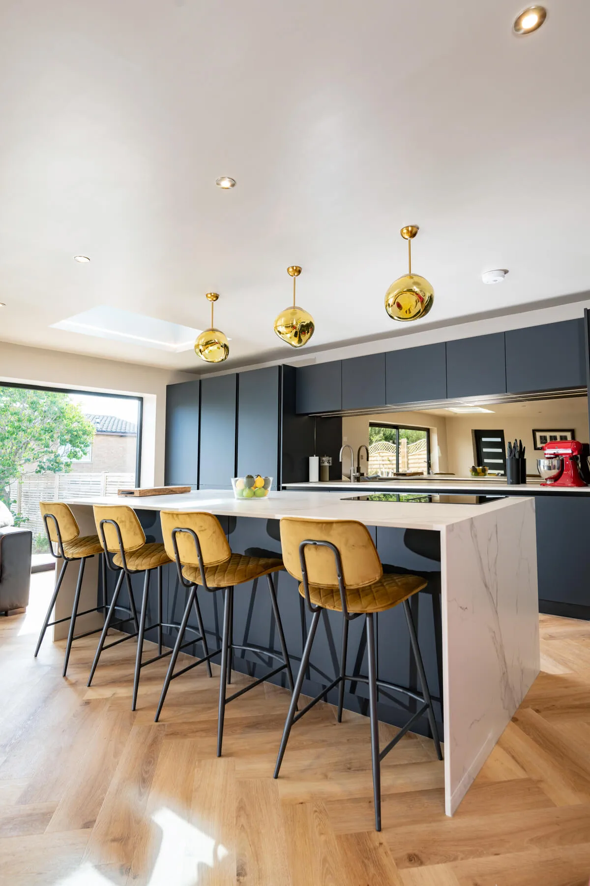 Minimalist kitchen with hidden storage, marble island and dark blue cupboards